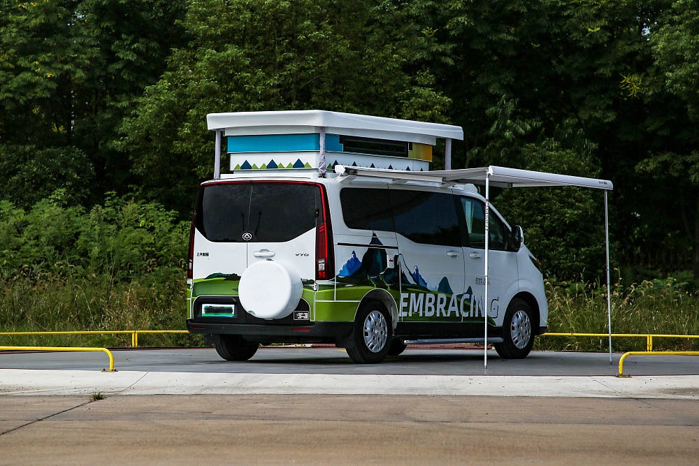 上汽大通MAXUS V70房車側提供了電源接口、注水口,保持了車身整體性,右側的戶外遮陽棚方便用戶簡單的戶外露營。