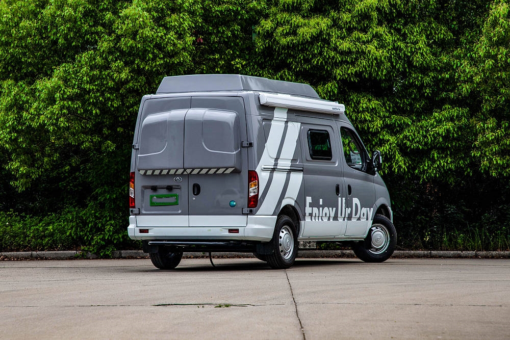 車(chē)頂采用加高硬頂設(shè)計(jì),目的是拓展車(chē)內(nèi)高度,而在車(chē)側(cè)、車(chē)尾部分我們同樣可以看到盲窗結(jié)構(gòu),最終新車(chē)的尺寸為5120x2018x2665(mm),3米以?xún)?nèi)的限高路段均可通行。
