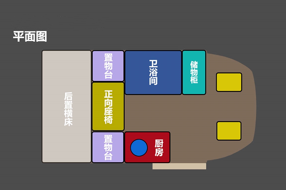 新車(chē)生活區(qū)由衛(wèi)浴間、廚房區(qū)、正向雙人座椅、尾置橫床組成,車(chē)內(nèi)布局比較緊湊,更適合2人左右的旅居體驗(yàn)。