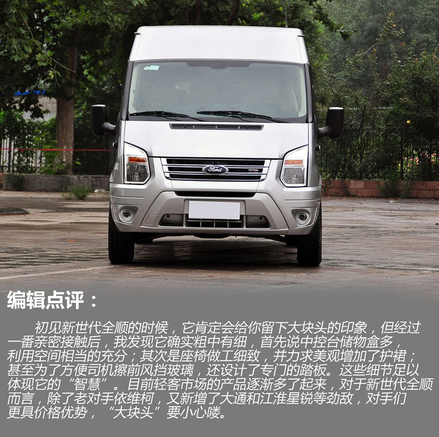 福特新世代全順的外觀設(shè)計(jì)簡潔時(shí)尚,配置實(shí)用,綜合性價(jià)比較高,動(dòng)力較好,提速快;操控性較不錯(cuò),換擋順滑;燃油經(jīng)濟(jì)性不錯(cuò)。