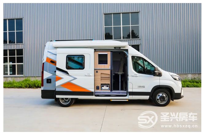 車身外觀采用拉花設計,簡約低調,整車尺寸為:5940 x 2110 x 2780(2980)mm。主駕駛一側標配:重力注水口和220V市電接口。入戶門一側配備:戶外廚房柴油霧化爐裝置、3000X2500(mm)遮陽棚、房車專用紗門、房車專用踏步;車體兩側均設有戶外照明燈,車頂為太陽能電池板及衛浴間雙向換氣扇,尾門可呈180°開啟。