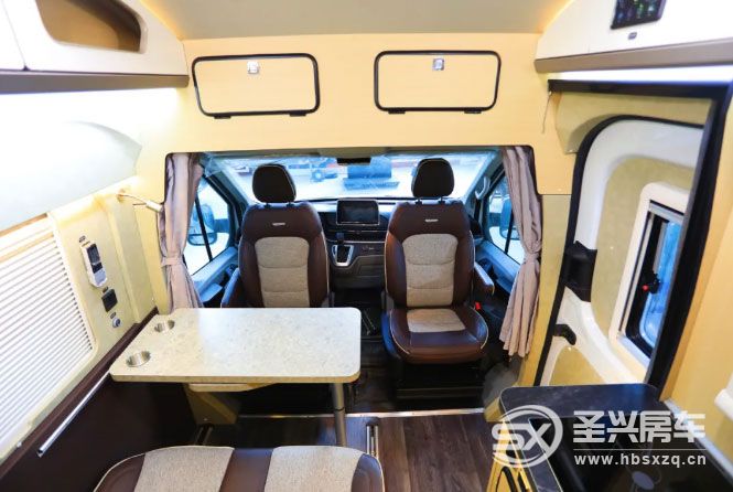 主副駕駛座椅可選單座或者雙座,座椅采用了舒服透氣的皮麻混搭材質,并均可360°旋轉,搭配可移動升降桌板,與后方座椅形成會客模式。駕駛室的密封方面很好的做到了控制胎噪、發動機噪音和風噪,營造了一個很舒服安靜的駕駛空間。