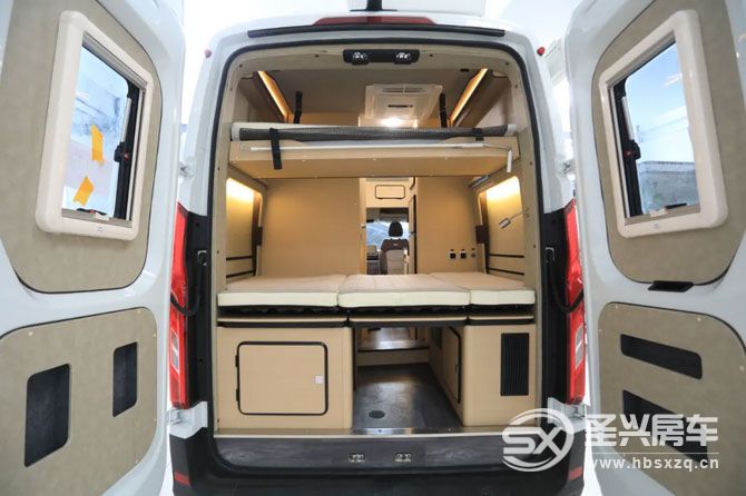 兩側采用的進口房車專用軟裝布料。如有身高要求可加后窗包(長接近兩米)。床鋪翻折起就是超大的儲物柜。