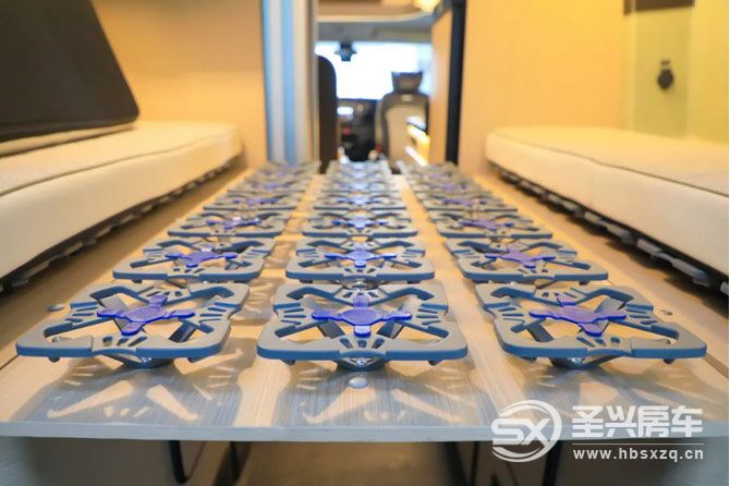 周邊還標配了游艇級閱讀燈、房車專用折疊電視支架及12V房車專用電視19寸、USB充電插口、220V插座,上方還有儲物吊柜和氛圍燈。