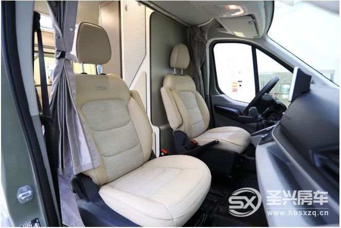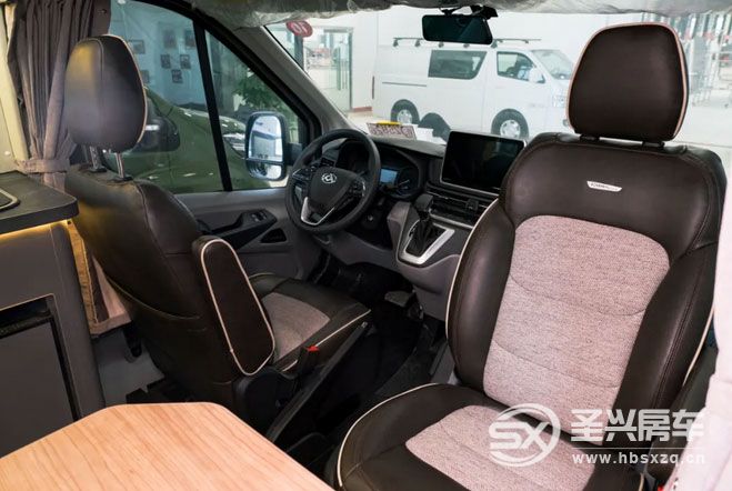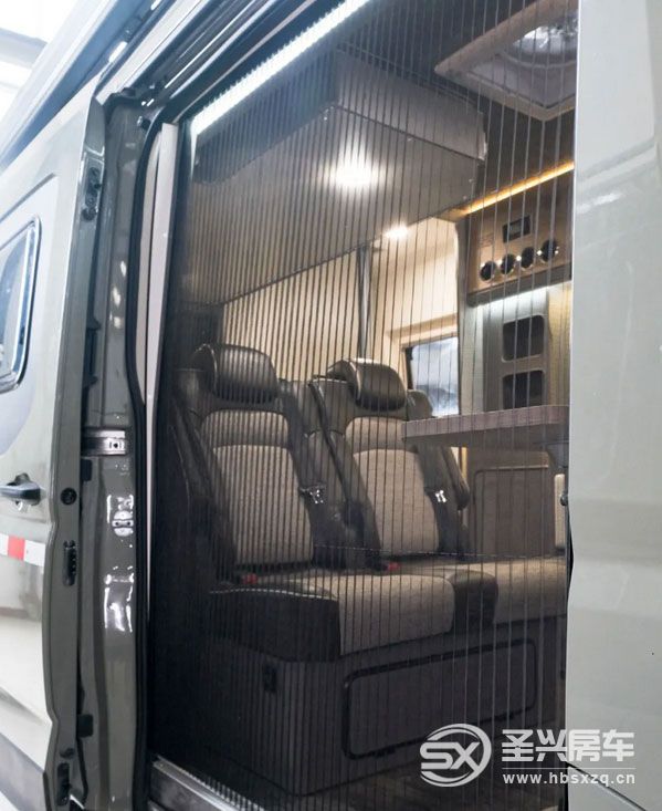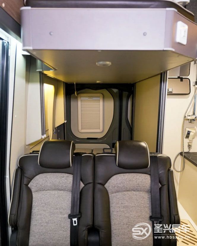 儲物/睡眠區: 白天是雙人座椅,晚上座椅放倒,與后方床鋪形成2050×1100(mm)的常態床,上鋪是2000×1000(mm)電動升降床。下方是大尺寸儲物空間。