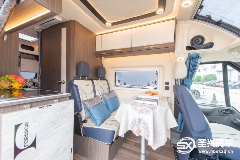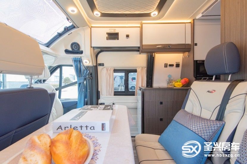 車(chē)內(nèi)整體采用賓利黃+象牙白的輕奢配色,兼?zhèn)鋾r(shí)尚與溫馨。后方生活區(qū)采用E0級(jí)環(huán)保標(biāo)準(zhǔn)房車(chē)家具板材搭配環(huán)保房車(chē)專(zhuān)用地板革的設(shè)計(jì),健康安全無(wú)污染,確保您在室內(nèi)可以安心生活,提高生活品質(zhì)。生活區(qū)布局合理,從前到后依次為會(huì)客區(qū)、廚房區(qū)、衛(wèi)浴區(qū)以及主臥區(qū)。駕駛室上方安裝了大天窗,加強(qiáng)了整個(gè)房車(chē)的空間感和通風(fēng)效果,優(yōu)化了房車(chē)的室內(nèi)采光。