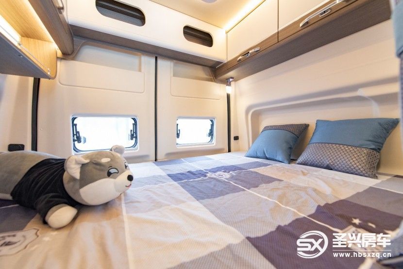 為了給旅客更加舒適的睡眠空間,尾部主臥區(qū)在車(chē)尾兩側(cè)增加了外拓盲窗,后床空間被拓寬到了2.05*1.35m,能夠滿(mǎn)足兩個(gè)成年人的休息需求。床鋪上方安裝了一排儲(chǔ)物吊柜,方便夜晚存放物品使用。尾門(mén)上設(shè)計(jì)了開(kāi)放式儲(chǔ)物柜和外推窗,在確保此處的通風(fēng)換氣的同時(shí)也能欣賞到室外的風(fēng)景。