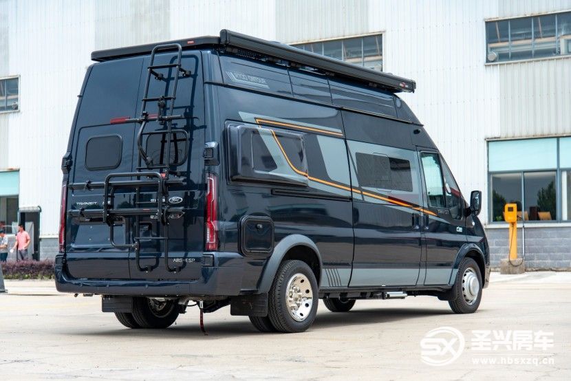 這款江鈴福特新全順B版房車(chē)整體外形十分亮眼,通身采用暗夜藍(lán)的涂裝,代表了江鈴福特的年輕化和運(yùn)動(dòng)風(fēng),它沒(méi)有同以往的房車(chē)一樣配置額頭床,而是采用了RTM高強(qiáng)度導(dǎo)水前頂造型,流線(xiàn)型的設(shè)計(jì),體現(xiàn)了該款車(chē)的運(yùn)動(dòng)魅力。該車(chē)在車(chē)頂配備了集成燈架、太陽(yáng)能板以及頂置空調(diào)等設(shè)備,車(chē)身外側(cè)安裝了熏黑手動(dòng)遮陽(yáng)棚、探照燈、商務(wù)告誡帶氛圍燈二級(jí)踏步等實(shí)用性配置,在儲(chǔ)存電力和遮陽(yáng)的同時(shí)又體現(xiàn)了顏值,正所謂是實(shí)力與顏值集一身的房車(chē)。在車(chē)尾,該車(chē)設(shè)計(jì)了美式鋁合金爬梯+雙車(chē)自行車(chē)架,整臺(tái)車(chē)美式風(fēng)格十足,凸顯硬漢本質(zhì)。