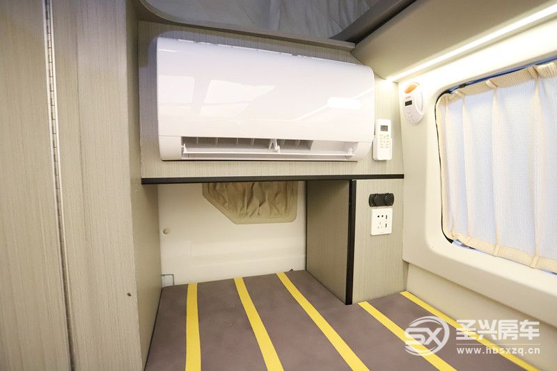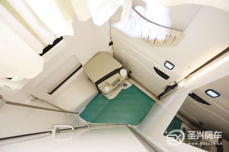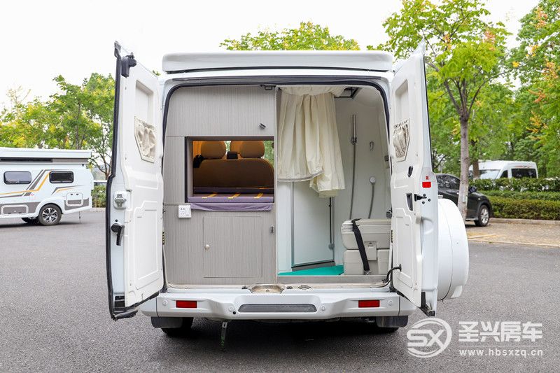 車尾對開門形式,最高打開角度90度,直接看到了開放式的衛生間和縱床的一個通風口,晴天駐車的時候可以可以晾曬一下衛生間,避免長期使用產生的潮濕和霉變。