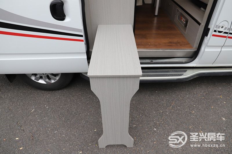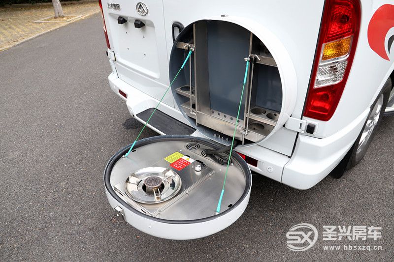 作為一款B型房車,外置廚房配置了兩套,如果使用原車油箱的柴油,那么車尾備胎式廚房可直接使用,如果使用電能源,那么右側中門位置的隱藏置物板可以使用電磁爐,在個別比較小的停車位,車尾廚房派不上用場,使用電磁爐更合適。