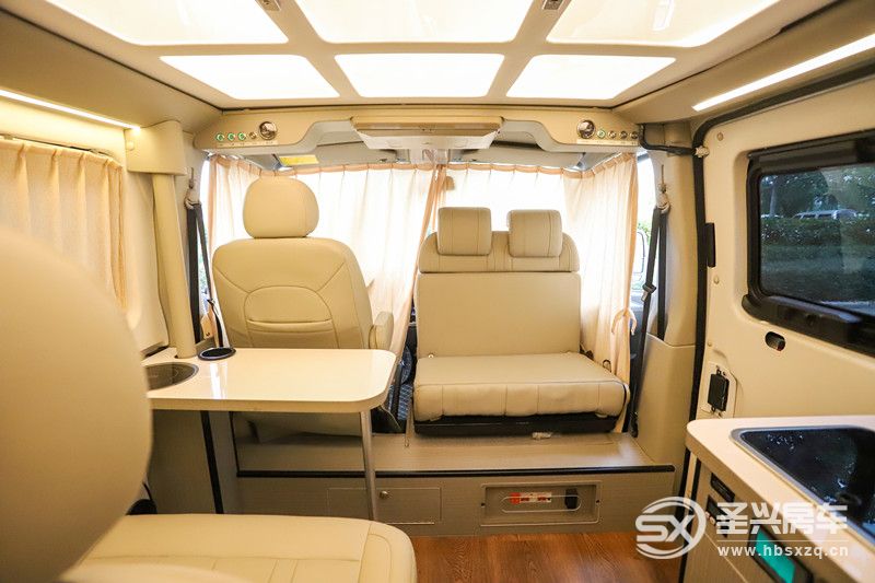車內布局非常簡單,米白色的內飾配色,基本沒有別的雜色,在暖色燈光的襯托下,整體氛圍比較純粹。生活區為前置雙人單排座椅+中置廚房+后置縱床+衛生間的基礎格局,當彈出式屋頂打開之后,車內的凈高度可以達到2米,不影響在車內的正常走動。總體的感覺來說升頂B型房車比常規硬頂B型房車頭頂空間更舒適一些。駕駛室右側的雙排副駕駛座椅在有需要的時候可以向后旋轉,與會客區雙人座椅形成一個簡易的會客區。