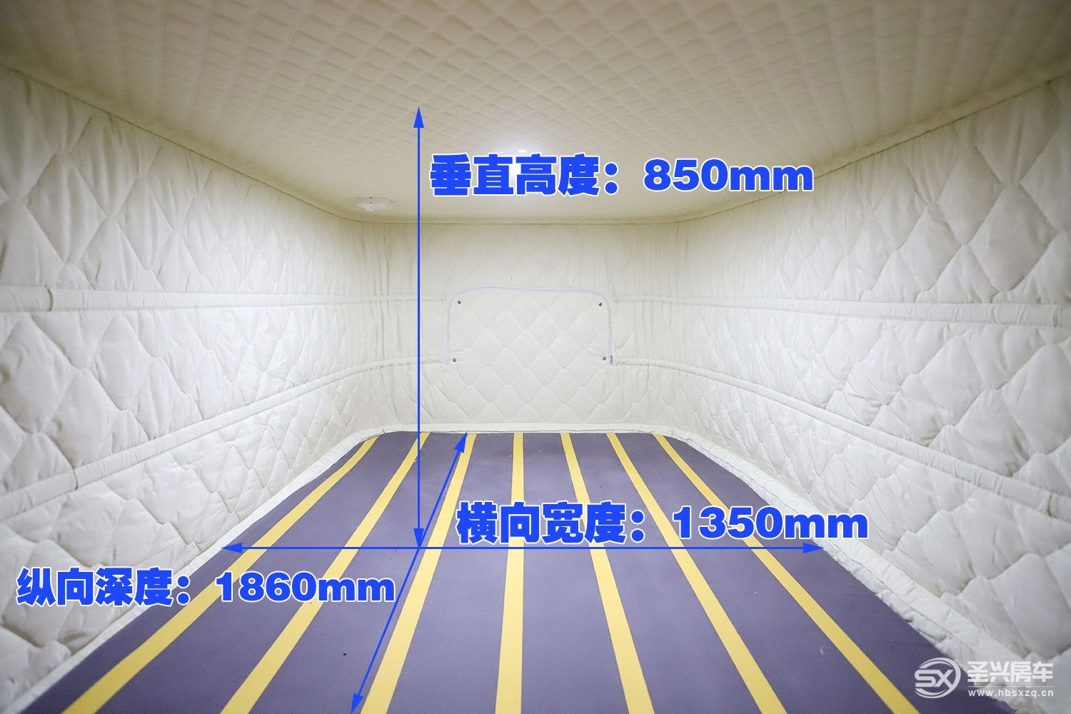 后床采用借位的方式(將單排座椅靠背放平)才能形成一張完整的單人床,最大尺寸2030×920(mm),當頂部彈出式床板放平的時候,后床距離頂部垂直距離也為850mm。