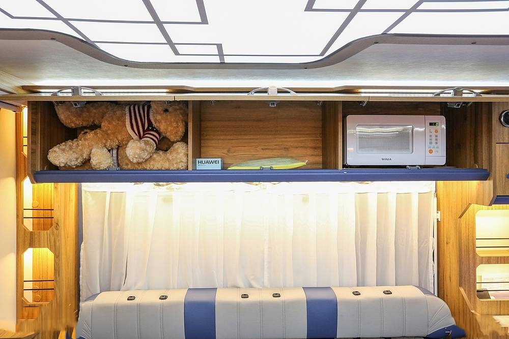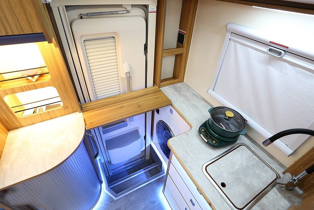 廚房配備洗菜池、冷熱水龍頭、切菜板、活動式電磁爐、進口大宇微波爐。后上門布局的房車尾置廚房一般都采用異形的操作臺設計,留下的缺口由一塊折疊板進行填補,實際上操作臺的尺寸和補齊的整個操作臺大小一致。這款車將洗衣機也集成到了櫥柜之內,相對使用要便捷一些,在車外就能操作。另外,四層抽屜也提供了充分的儲物空間。