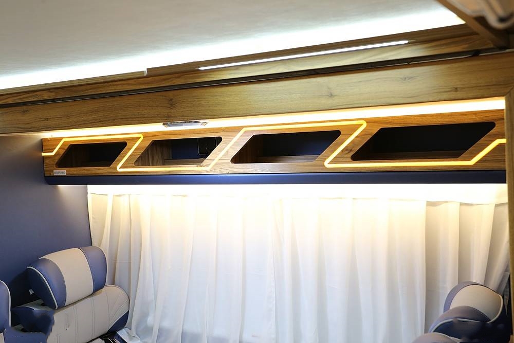 內飾方面,勇者房車內部采用藍白內飾風格作為全新的設計,有點海洋系的感覺。整體感覺來說,白藍配色觀感清新,加上原木色的板材飾面,更加原生態。吸頂式造型頂燈與四周吊柜造型相呼應,頂燈與氛圍燈帶相襯托的整體燈光效果,使得夜晚的車內空間充滿了居家溫馨感。布局方面,整車以額頭床+中置長條沙發+4人會客區+車尾廚房+衛生間布局,對于這款布局我們比較常見,但對于勇者這款房車來說,是第一次嘗試,側向沙發和4人會客區座椅全部來自于乘用車的座椅標準,安全性上得到了保證。