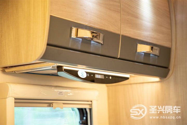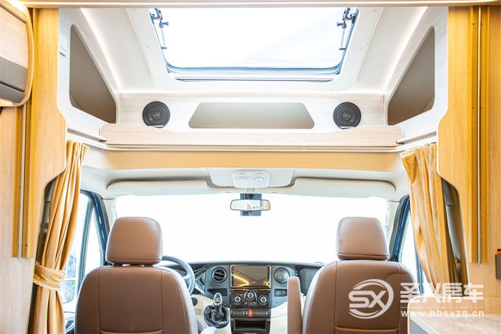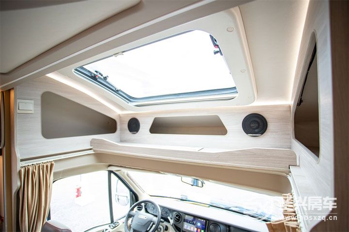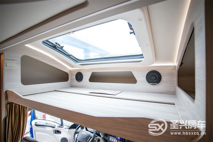 自行式C型房車中常見的額頭床部分,這里變成了讓房車更加舒適的采光窗和抽拉式儲物空間。