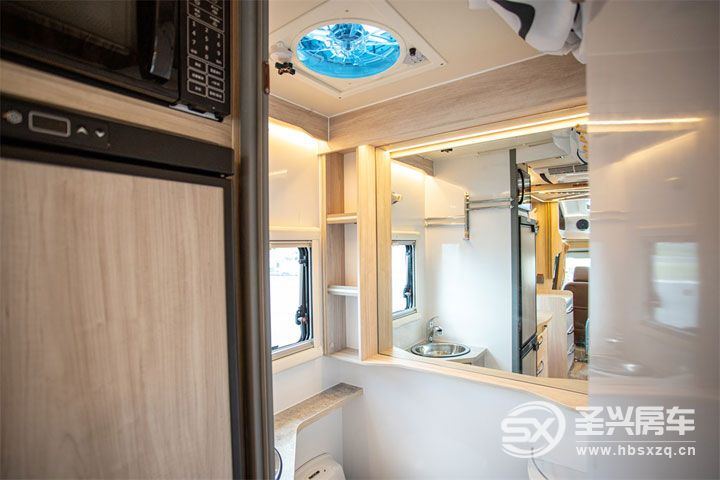 這臺S800在布局方面選擇了經典的后縱置床+吊床,在空間的利用和床位的數量上都有著獨特的考量。然后利用采光和木色紋理的暖色調讓旅行生活中充滿了活力和新鮮感。