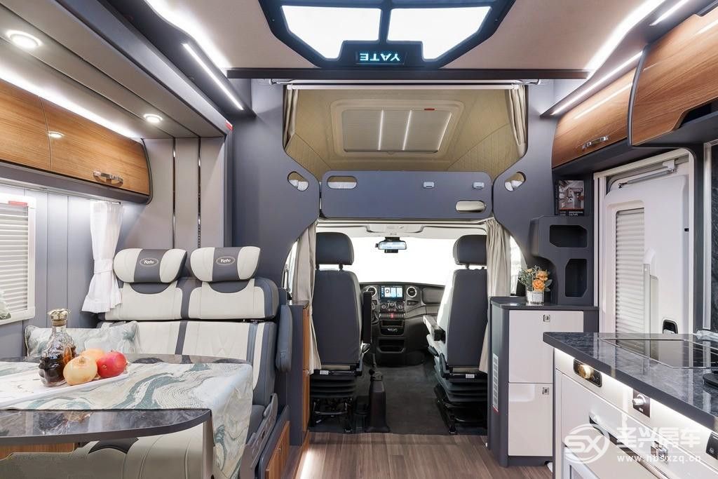 會客區采用的是經典的卡座設計,整體的灰白配色,額頭處的三個實木收納柜又增添了穩重感,坐在豪華乘用車可調節座椅上,是多么舒適啊,這個座椅還可以拼成床,桌子也是房車專用的搭桿式折疊桌,不得不說這款車在設計上是有很多巧思呢!