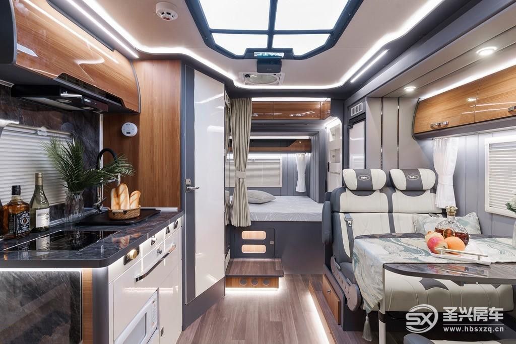 進入車內,小編腦海中就浮現了高級感、北歐風幾個字。灰白相間的設計,精致舒適的軟包、環保組合家具,再搭配上房車專用環保地板革,高檔的百褶布藝窗簾和床簾,變溫可調式氛圍燈和主照明一照,相信你也能在這樣的氛圍中感到心情愉悅吧~