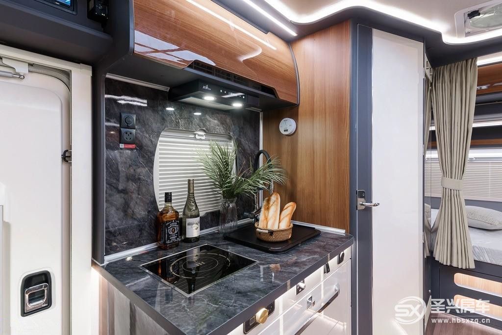在廚房區域,車載專用冰箱保證你每天可以吃到新鮮食材。帶蓋水槽、電磁爐、多功能微波爐、抽油煙機等是你大展廚藝的好工具。廚房還有一個小窗戶,既通風透氣,又可以看窗外風景。此外高彎可調節水龍頭和獨立凈水系統,解決做飯中的水源問題,快來做上香噴噴的飯菜吧~