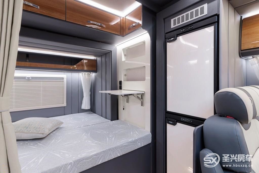 這款房車配有兩個床鋪,一張額頭床,一張后橫床,后床還有拓展折疊書桌。兩張床都是雙人床,可以容納兩成年人,都配有高密高彈海綿床墊,整體淺灰色的色調讓你的夜晚更加寧靜,睡得更加舒心。