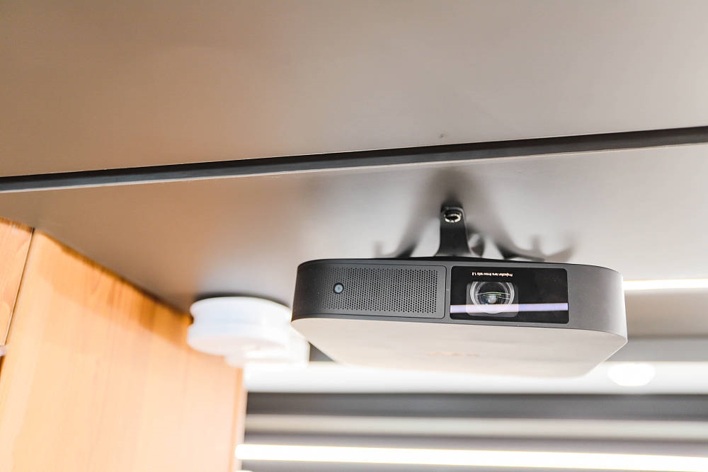 得益于雙拓展的寬大空間尺度,車(chē)廂娛樂(lè)主要靠一臺(tái)極米投影儀與60寸電動(dòng)投影幕的組合,可讓房車(chē)瞬間變身娛樂(lè)空間和移動(dòng)影院。
