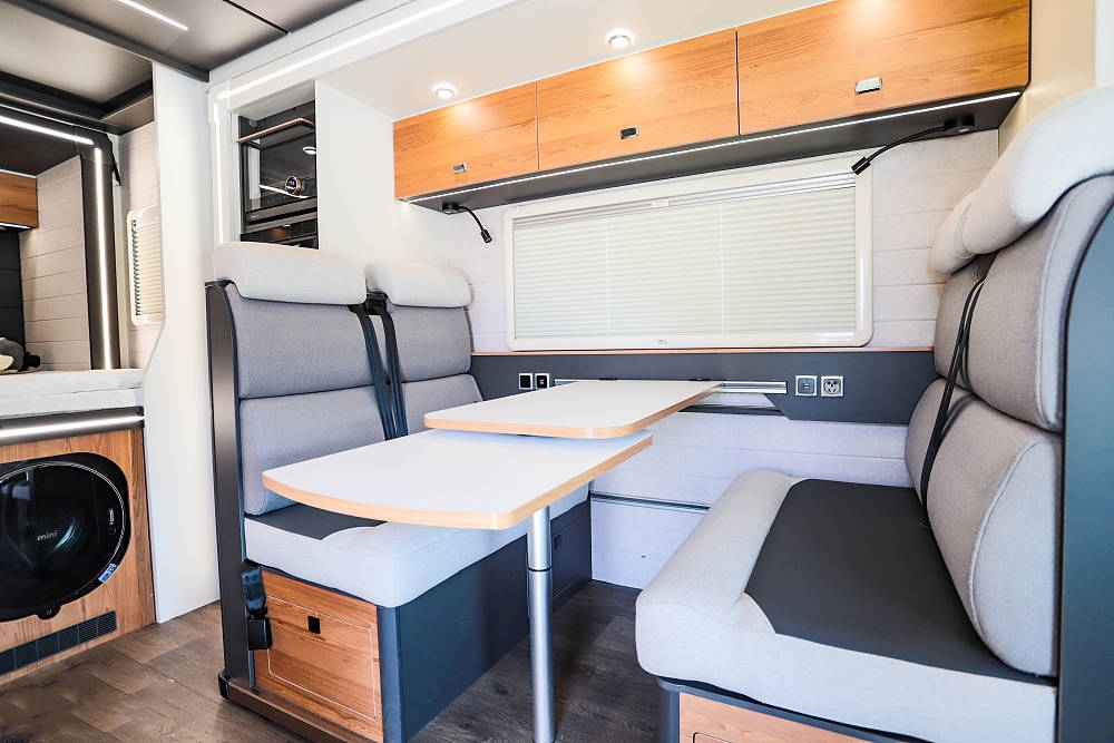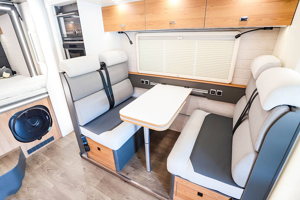 會(huì)客區(qū)橫向空間表現(xiàn)優(yōu)異,餐桌表面是白色原木紋理并配備延長(zhǎng)桌板,打開(kāi)后更方便日常就餐娛樂(lè);雙卡座沙發(fā)座椅下方內(nèi)有乾坤,各內(nèi)置一組大容積抽屜,充分利用零散空間提升儲(chǔ)物效率。餐桌降低后還可與沙發(fā)組合成一張臨時(shí)床鋪使用,超大尺寸外推窗為客廳提供足夠的采光和通風(fēng)效果,同時(shí)也可以欣賞車(chē)外的風(fēng)景,為旅途增添樂(lè)趣。