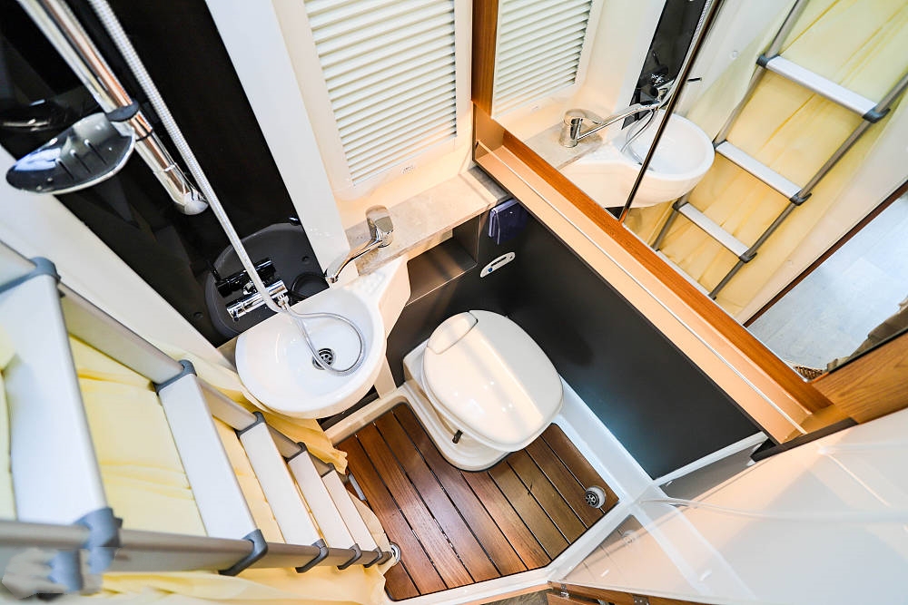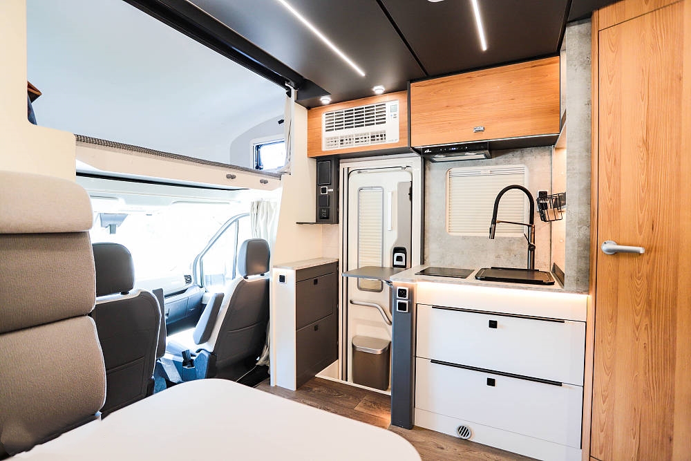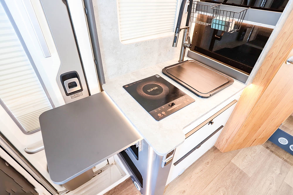 廚房區(qū)位于沙發(fā)區(qū)對(duì)側(cè)緊鄰房車(chē)中門(mén),一字型操作臺(tái)帶有折疊式擴(kuò)展臺(tái)面,配備帶蓋板的不銹鋼洗菜盆、全尺寸龍頭、電磁爐,臺(tái)面上方配有油煙機(jī)、通風(fēng)窗和一組吊柜,下方設(shè)置兩組抽屜可以收納廚房調(diào)料、碗筷等。