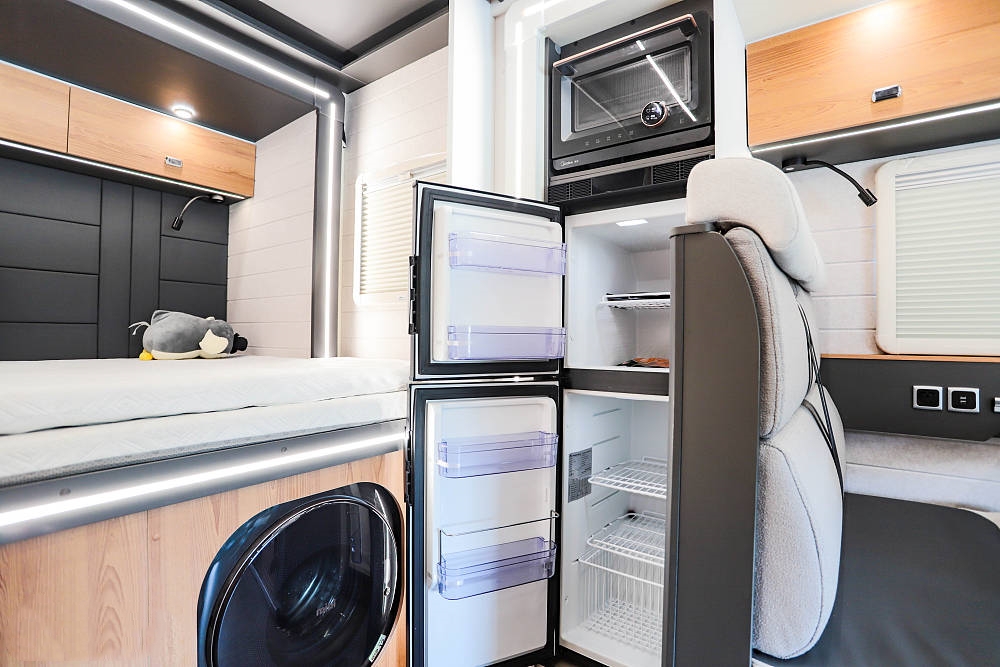 135L阿雷納房車(chē)專(zhuān)用冰箱和美的微烤一體機(jī)一起放在了對(duì)卡座沙發(fā)區(qū)的后側(cè),雙門(mén)大容量冰箱滿足了食物冷凍和冷藏的需求,為旅途中的用餐帶來(lái)便利。