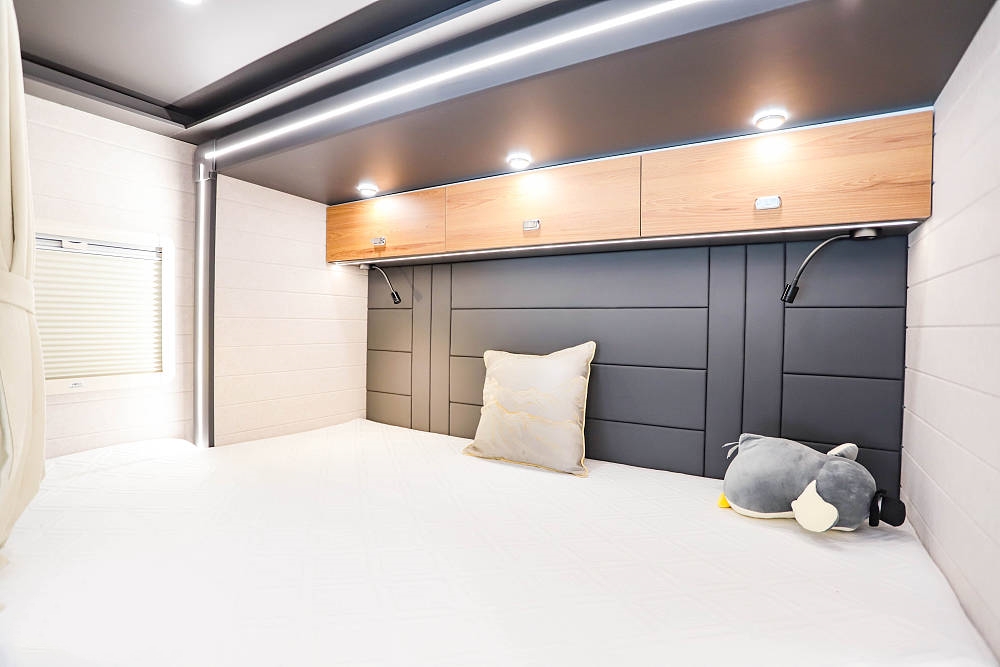 尾部拓展增加了車(chē)長(zhǎng),藍(lán)牌房車(chē)亦可擁有寬闊雙人床,提供一張2.1米*1.9米的超寬雙人床,室內(nèi)設(shè)計(jì)貼心溫馨,仿佛家中臥房一般。旅途與居家體驗(yàn)再難區(qū)分,讓每一次旅程都成為您生活中的一部分。橫置大床布局能保證舒適的睡眠空間和充足的儲(chǔ)物空間。床鋪兩側(cè)設(shè)有外推窗,為臥室提供良好的采光和通風(fēng)效果,上方的多組儲(chǔ)物衣柜方便收納衣物和其他物品。