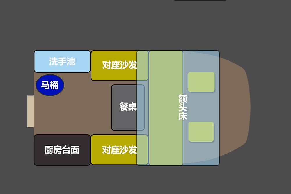 生活區(qū)內(nèi)部由額頭床、對向卡座、廚衛(wèi)區(qū)組成,內(nèi)部只能在駐車休息時使用,行駛中不能載客。內(nèi)部整體風格清新宜家,針對整體布局來說更適合2人左右的旅居需求。