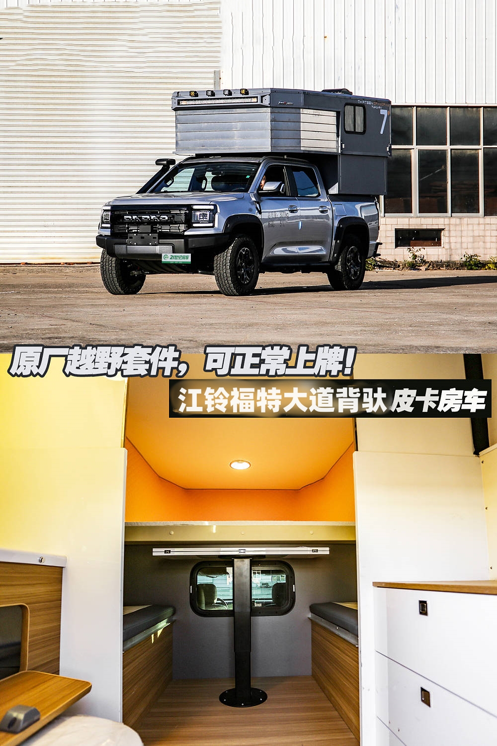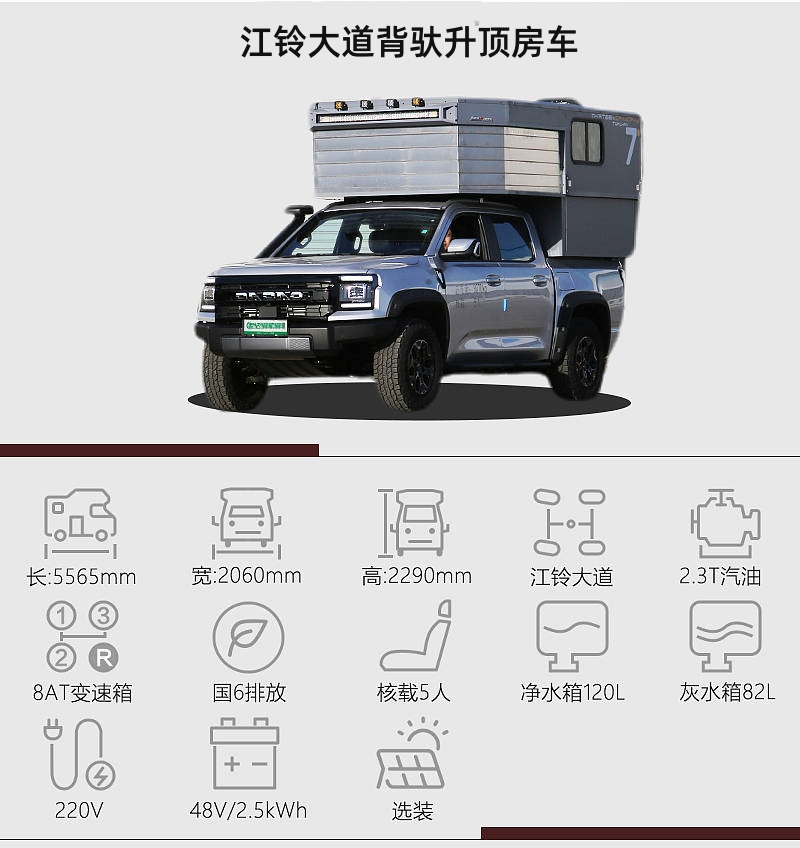 皮卡房車的好處有很多,比如自身帶有四驅(qū)系統(tǒng),可以適應非鋪裝路面;相比常規(guī)底盤來說,皮卡房車車身高度適中,一些城市路段也能正常通勤。江鈴大道底盤打造出了一臺背馱式升頂房車,越野性能強悍、實用性高。