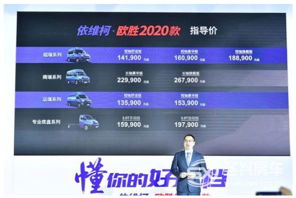 南京依維柯于2019年9月5日成都國際車展上震撼推出了依維柯歐勝2020款。這一爆款新品為用戶量身打造,刷新用戶期待,標配高端,車型豐富,極具品價比。超瑞短軸舒適版141,900元起;商瑞長軸豪華版229,900元起;運瑞短軸舒適版135,900元起;專業底盤159,900元起,更有首批車主“搶訂禮”和車展現場訂車六重定制禮包。懂用戶所想,供用戶所需,“懂你的好搭檔”依維柯歐勝2020款即刻開啟定制。