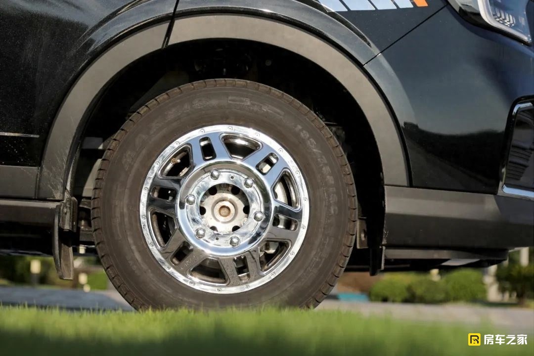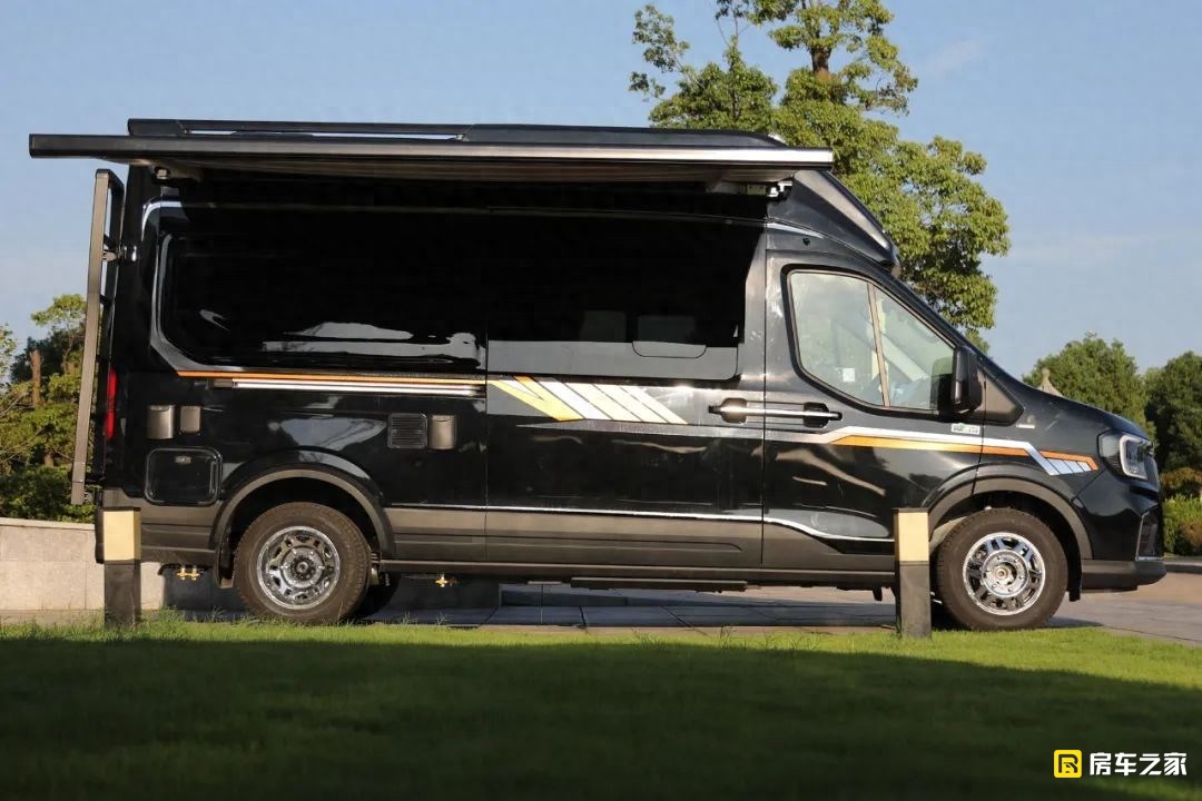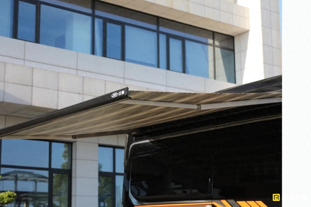 從車身正右側來看,因為在垂直高度上設計了一體式車頂,高度有所增加,所以看起來車身并不會特別修長。車身右側配備了一款電動風感式遮陽棚,最大伸縮長度3.5米,簡單說就是當風力超過了3級之后,防止損壞遮陽棚,它自己就會收回去。另外,對提升整車顏值的加分項在這套鋁合金輪圈,同時在輪圈表面還做了電鍍工藝,所以看起來更漂亮。