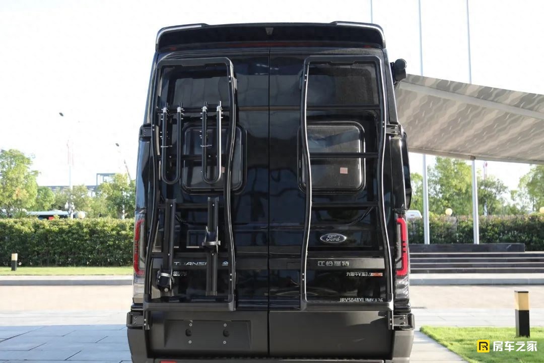 來到車尾部分,左右對開門打開方式,且配備了后爬梯和自行車裝載架的總成套件。另外,特別有意思的是后車尾還安排了一個尾翼,行駛過程中多少也能產生一定的下壓力吧。