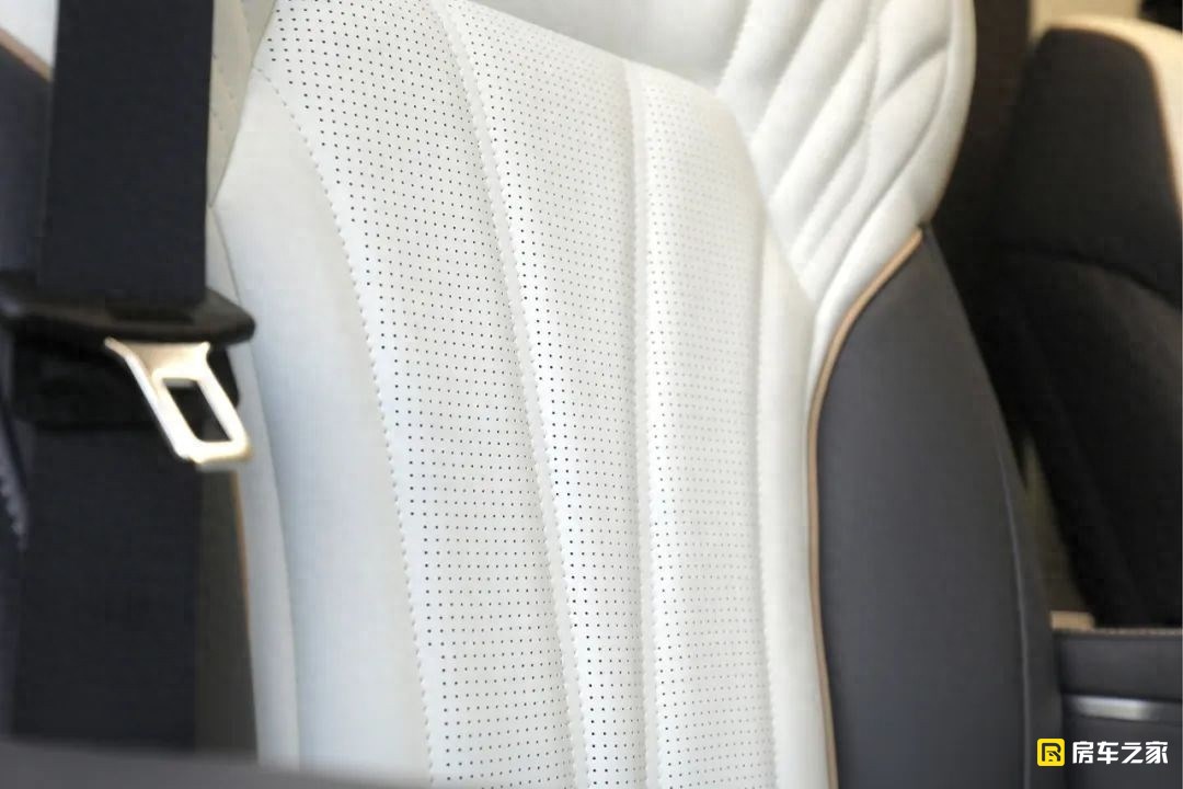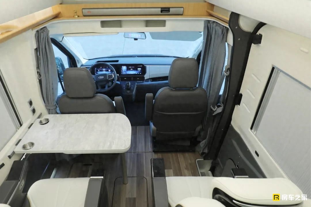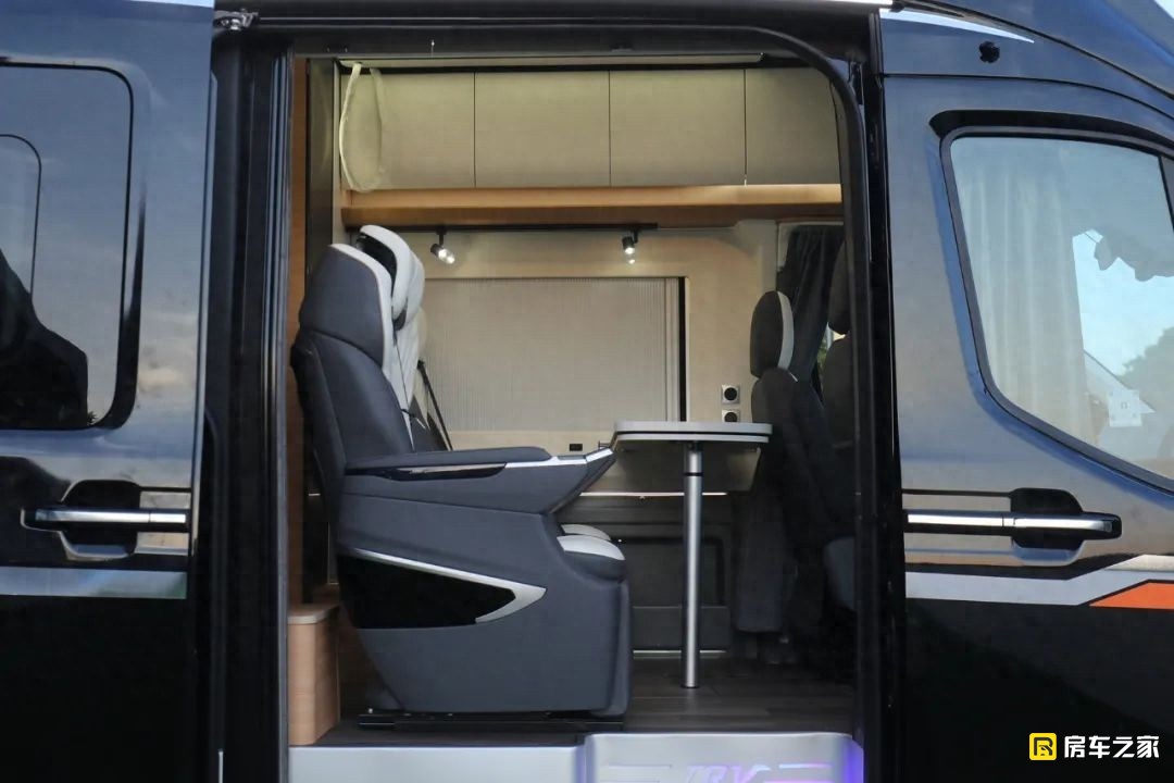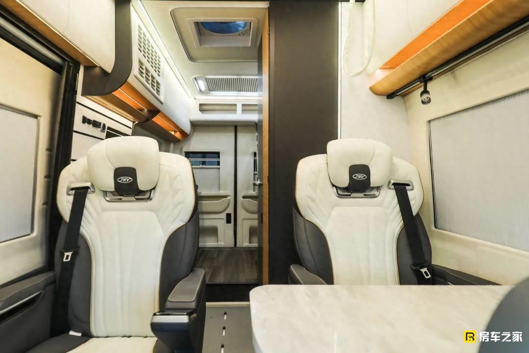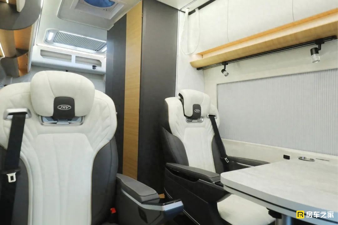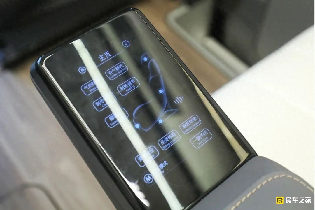 這款車包含了旅居版和商旅版兩個版本,實拍到的是商旅版,區別最大的就是客廳區域,旅居版為兩個連著的航空座椅,預留出相對大一些的廚房。商旅版生活區中前部是兩個獨立的航空級座椅,包含了常規的通風加熱和靠背按摩功能,前側腿托支持電動調節。