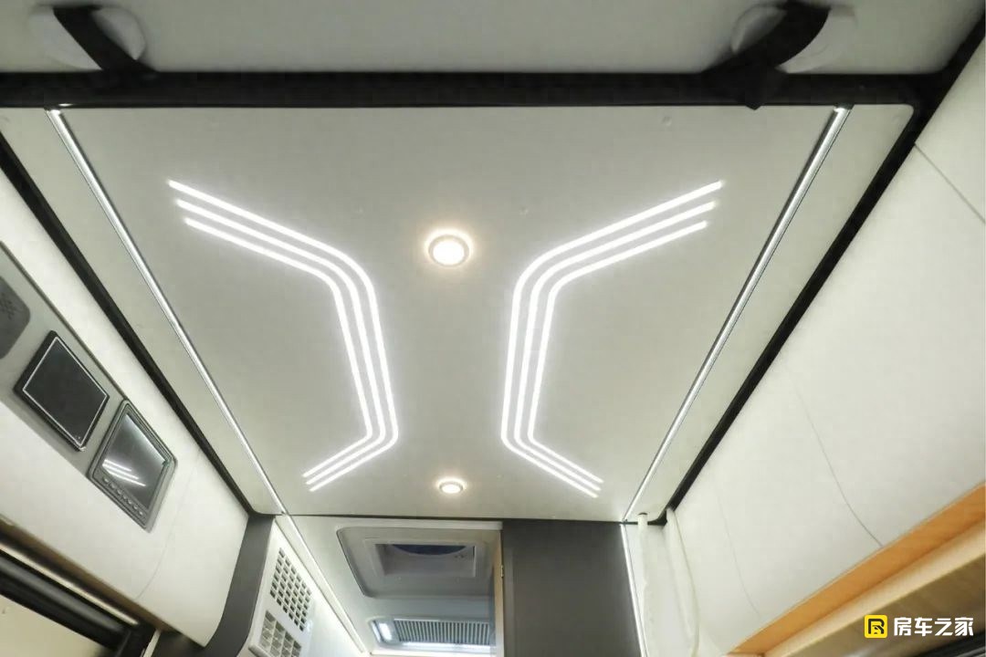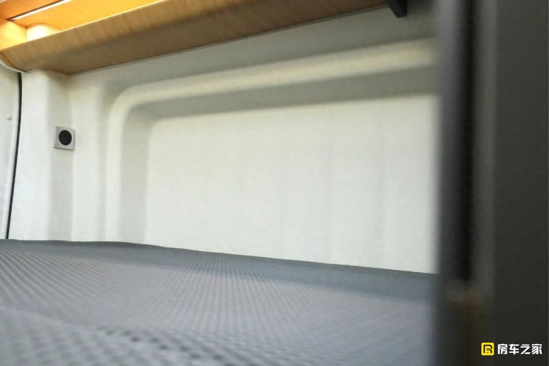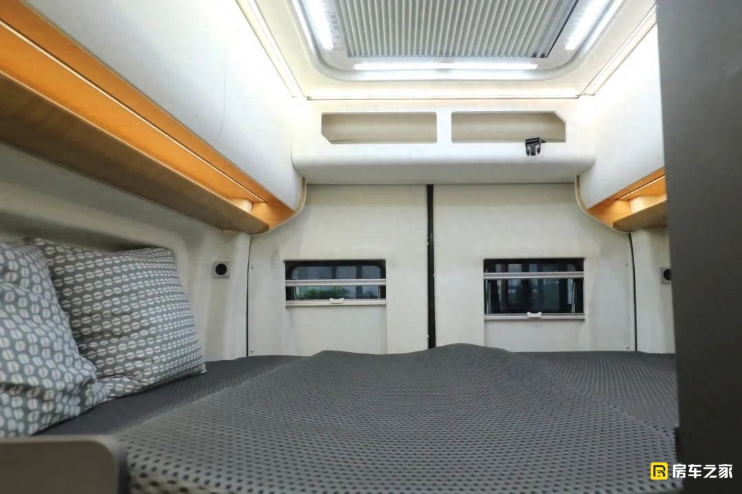 后床區域是目前能看到的B型房車中設計最為規整的一款,首先全車內部箱體的吸塑開模本身就不常見,搭配這種類似飛機航空艙吊柜門的形狀,看起來異常舒服。我們在車外看到的兩側盲窗外拓的設計在車內的橫床區域有了比較明顯的表現,它的后床位尺寸達到了2000×1300(mm),配備了一款叫做4D的空氣纖維床墊,舒適性果然也還不錯。