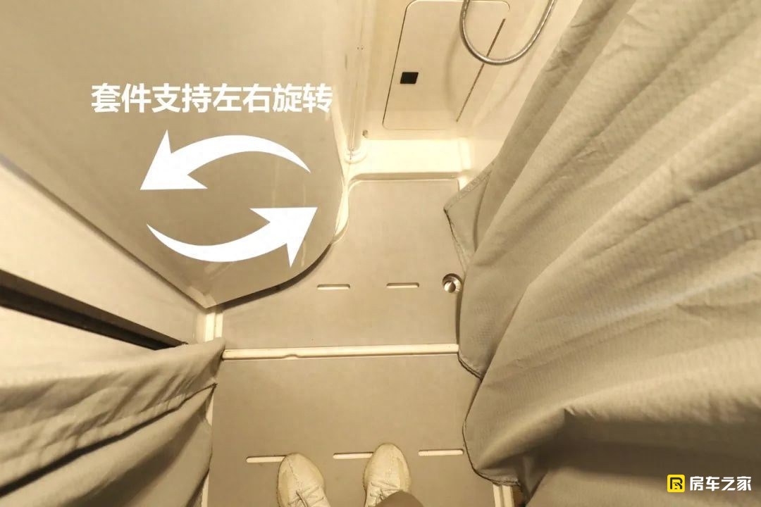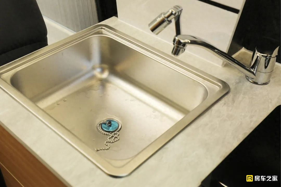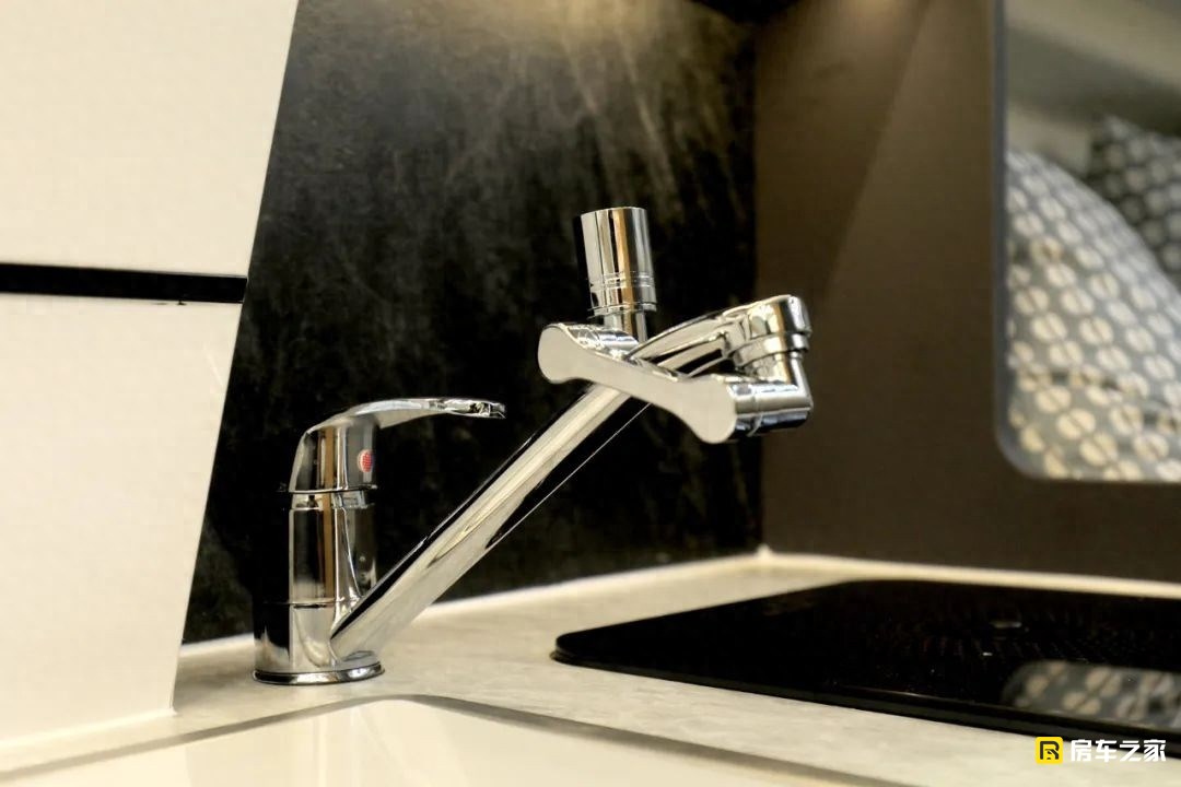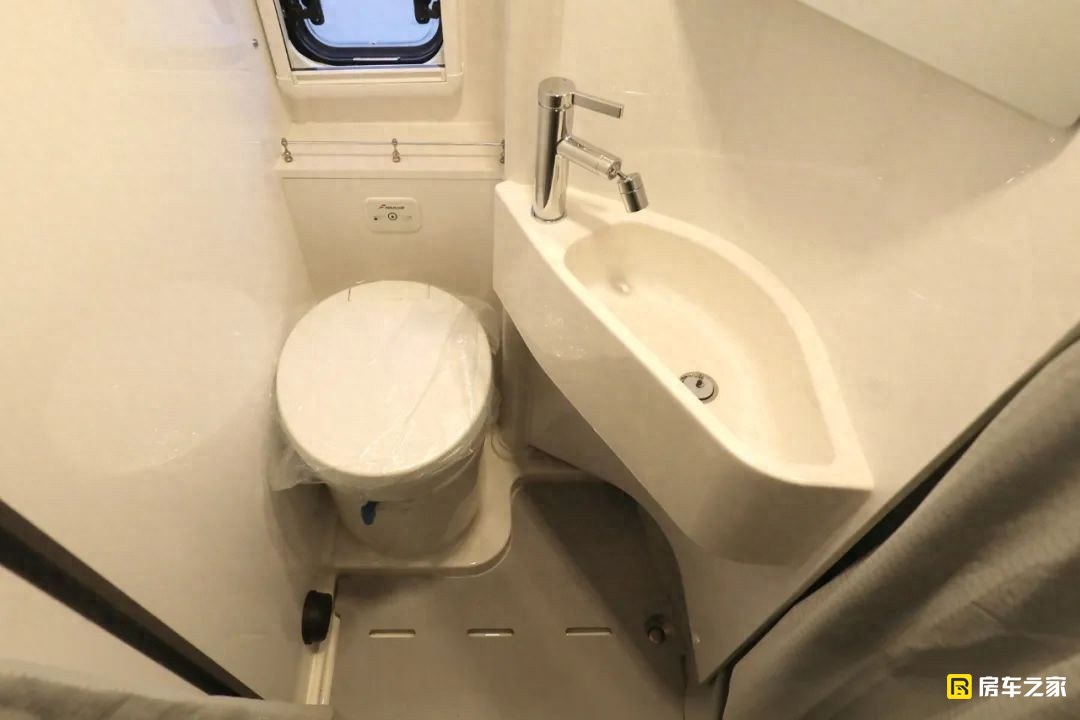 我個人比較喜歡這款車衛生間的設計形式,走進衛生間乍看居然沒有任何的生活設備,當你仔細去研究的時候會發現,這款車做了一個比較討巧的套件,將馬桶和洗臉盆都集成到了這個位置,當我們在淋浴的時候,整個空間就獨立出來了,這種形式的設計需要給設計師一個表揚。水路系統方面,配備的是206升凈水箱,50升灰水箱。其中凈水箱包含100升室內水箱和106升室外水箱,目的就是保證有一個水箱是防凍的?;宜鋸氖褂谜叩膩碚f,確實不算大。
