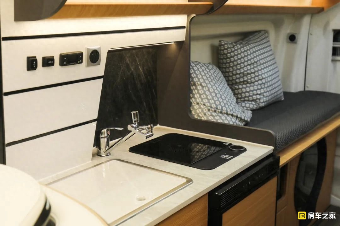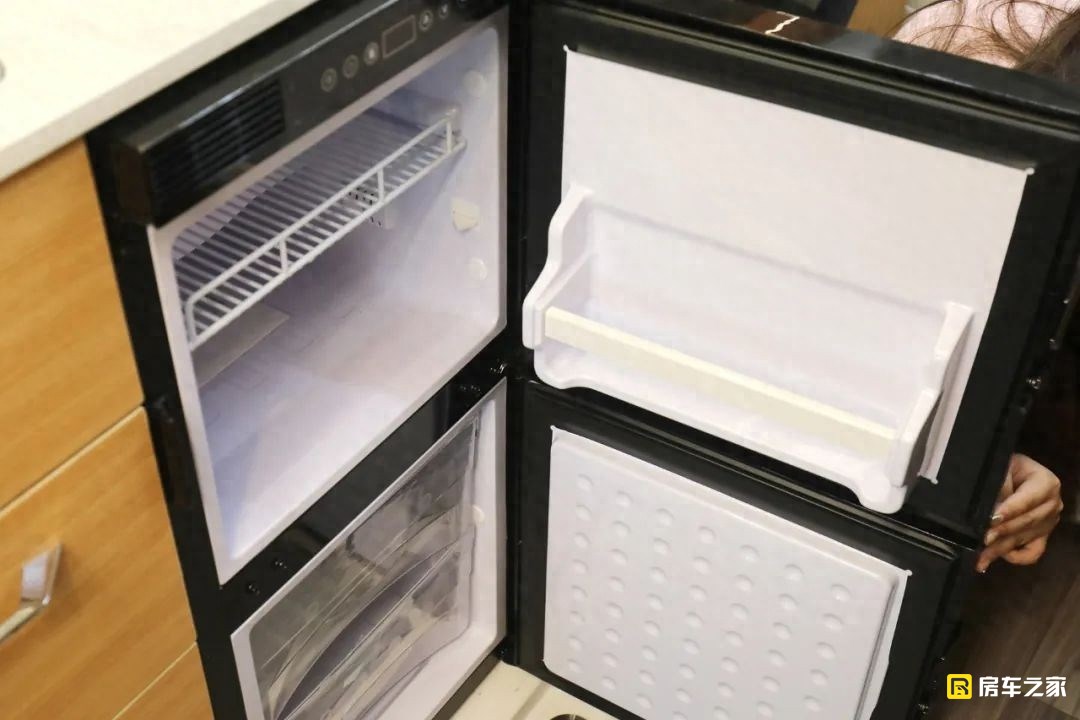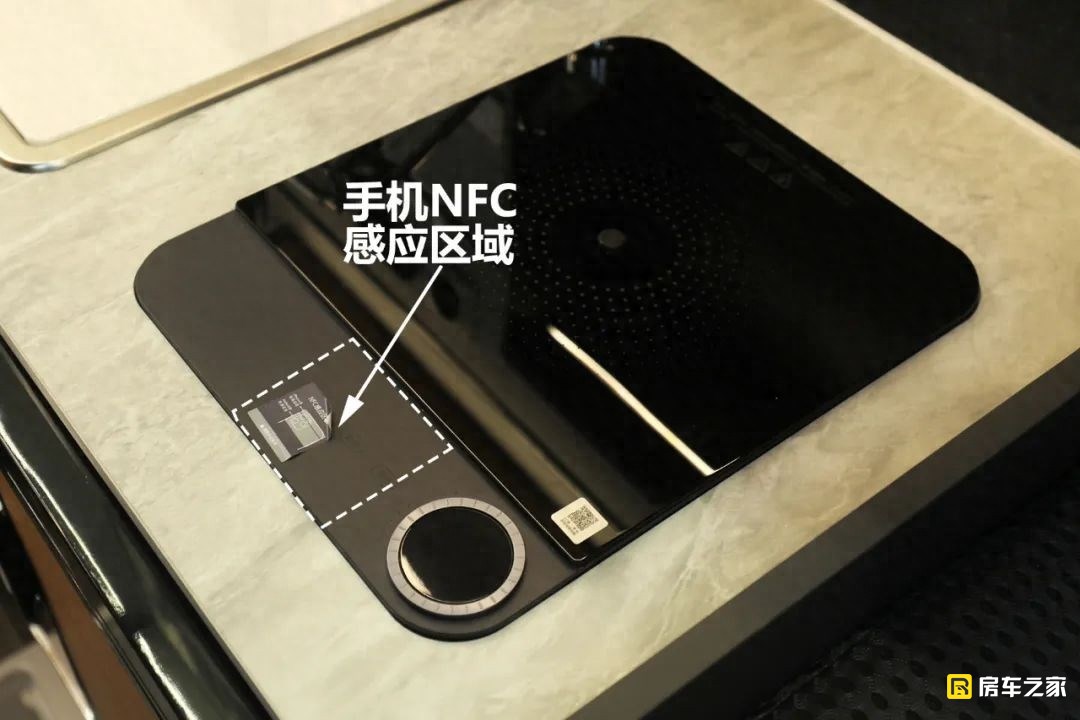 作為一款商旅版的布局,車內的廚房區有意弱化,旅居版明顯要好很多,配置方面,配備了來自米家的智能電磁爐,可以手動使用也能夠使用手機NFC感應開啟,確實要方便很多。商旅版搭配的是一款98升的冰箱,而旅居版稍微大一點,來到了118升。