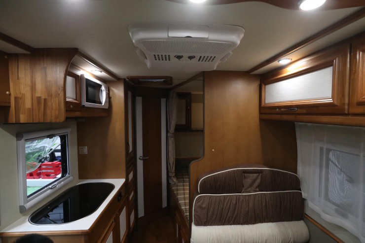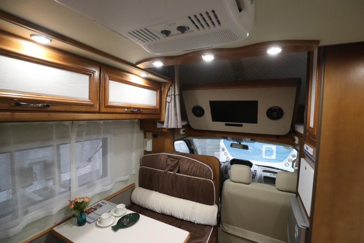 走進(jìn)車廂內(nèi),實(shí)木板材打造的整體家具,讓乘客仿佛回到了自己家中。車輛格局采用的是最經(jīng)典的格局設(shè)計——駕駛艙+前額床+會客區(qū)+吧臺+廚房+衛(wèi)生間+縱置雙人床+上床。這樣的布局比較符合國人生活習(xí)慣。