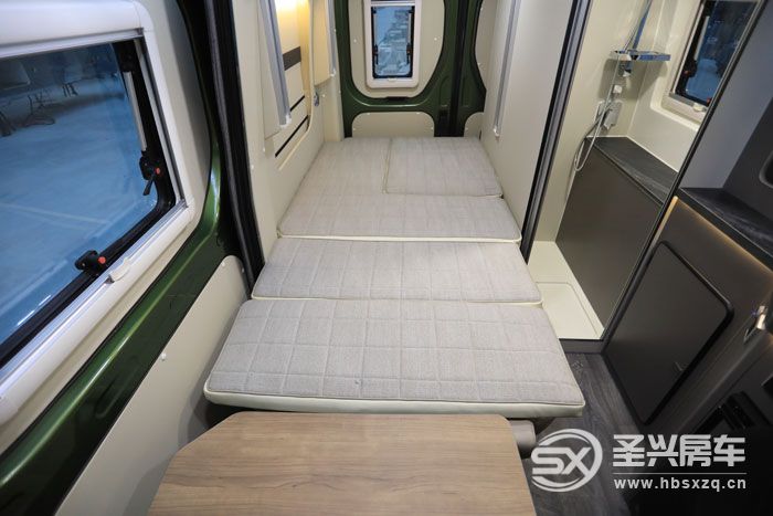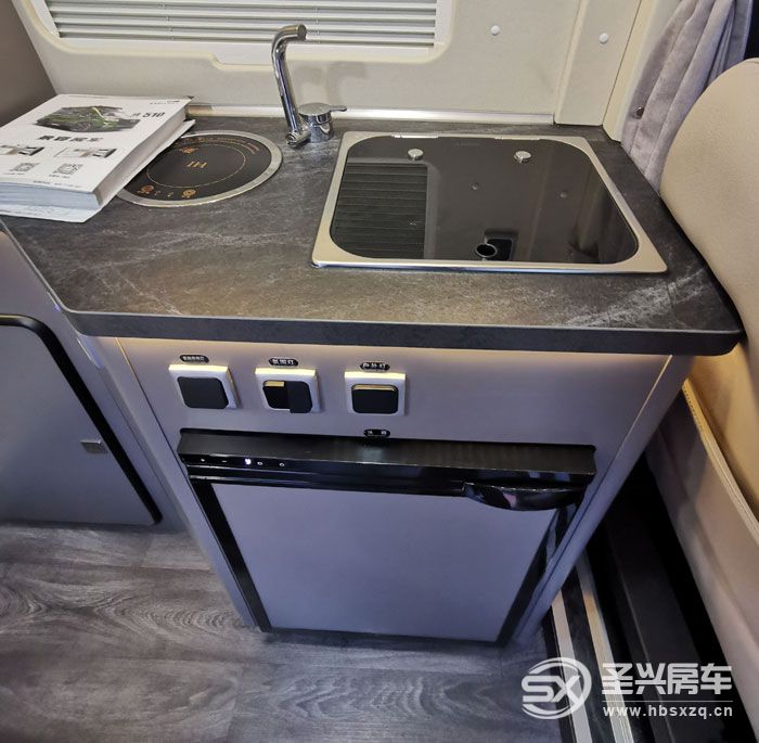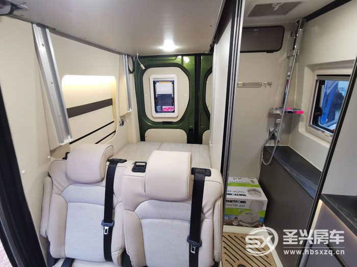 短軸房車內(nèi)部往往都是采用緊湊型布局,這款也不例外。駕駛艙1+2能坐下3人,后部會客區(qū)雙人座椅全車荷載5人。前后排座椅中間設計有餐桌,內(nèi)側設計為多個功能組合柜,配置也不少,有電磁爐、洗菜盆、65L車載冰箱、上部還有一臺24V直流變頻空調。