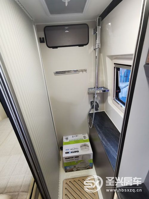 衛(wèi)生間外部設計有卷簾門,配有便攜式馬桶、淋浴花灑、毛巾架、側面有外推出頂部有換氣扇。水路系統(tǒng)配有100L凈水箱以及50L灰水箱。
