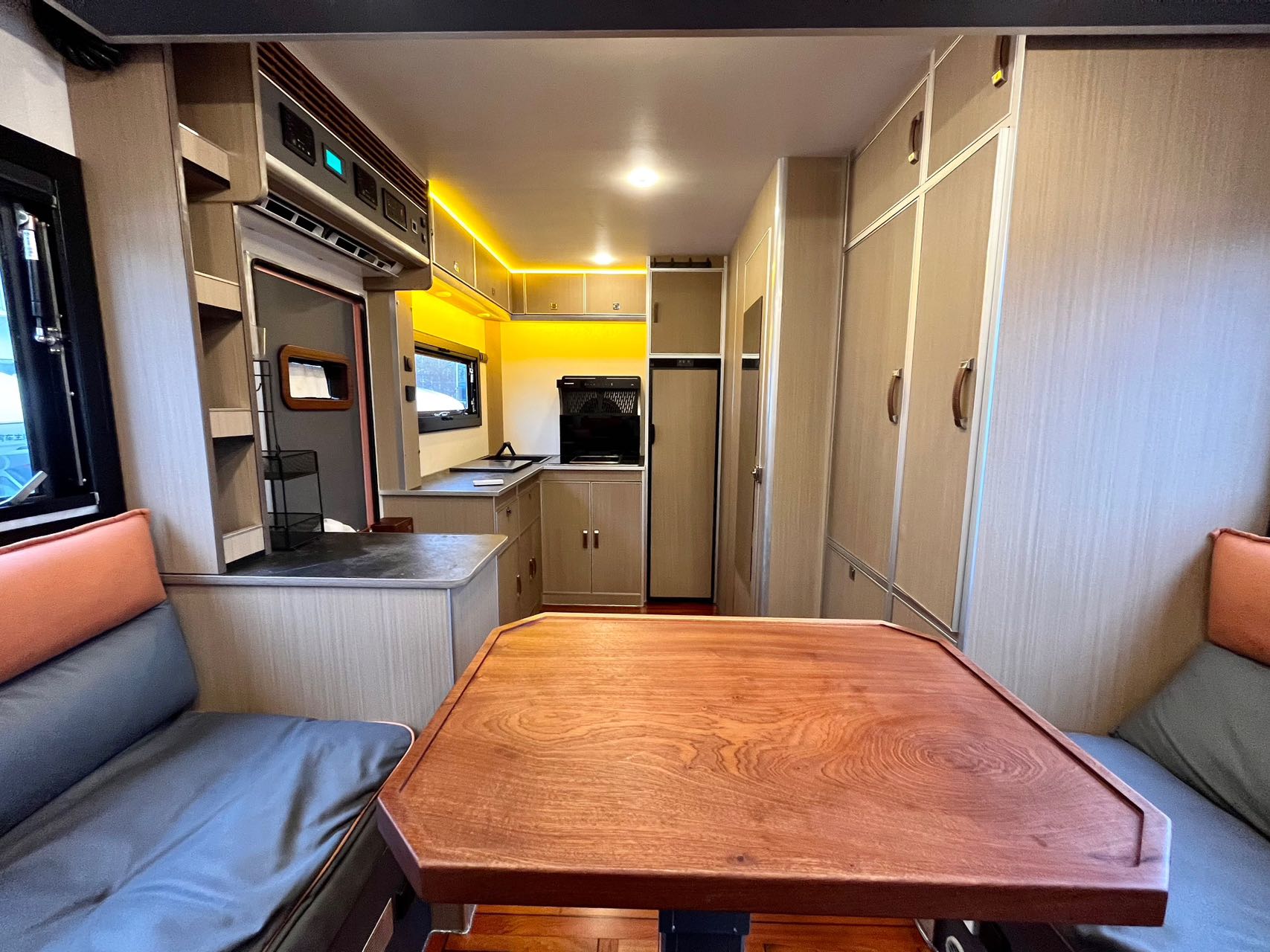 【戶外配置】:220V市電接口,重力加水口,電動戶外遮陽棚,中門密碼鎖,五階上車踏步,電動升降儲物箱和摩托車架,車頂射燈