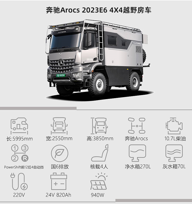 一款由奔馳Arocs 2023E6 4X4底盤改裝的越野房車,奔馳售價(jià)最貴、定位最高的產(chǎn)品,也是現(xiàn)目前房車產(chǎn)品序列中的旗艦產(chǎn)品。