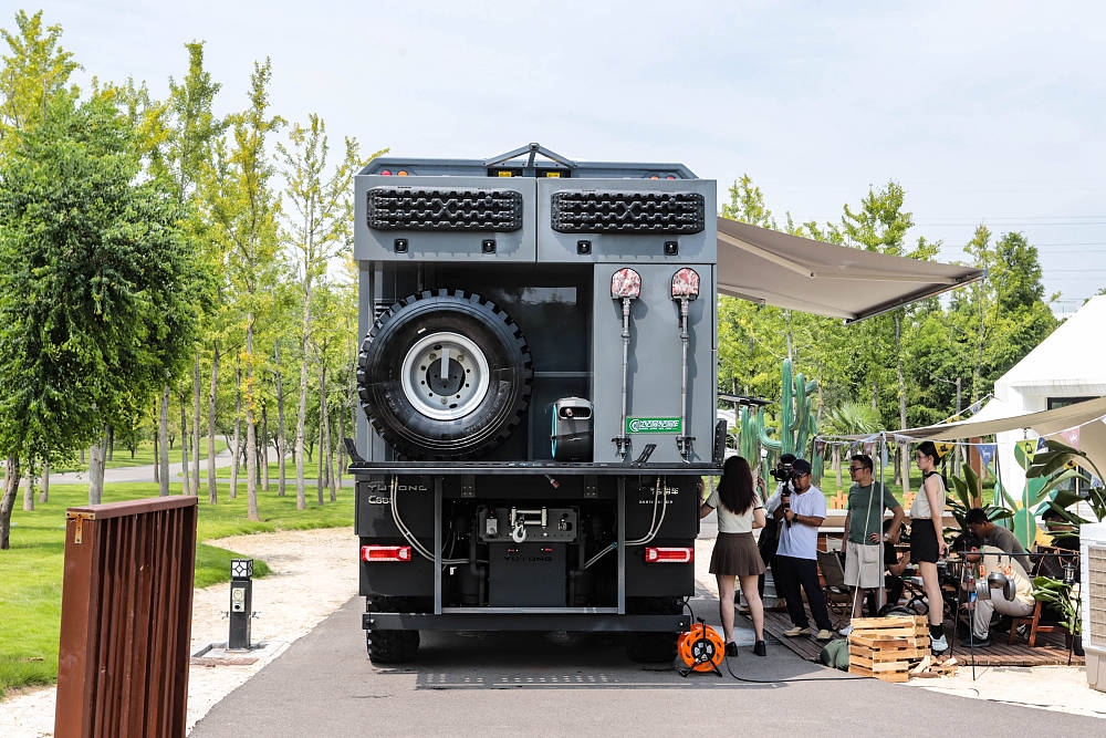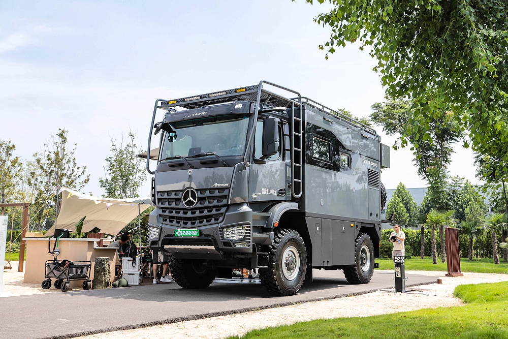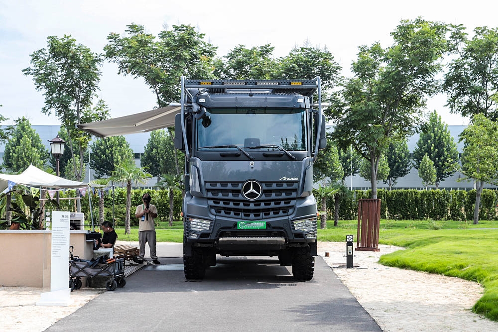 奔馳Arocs 車體采用定制增強(qiáng)廂體+高保溫材質(zhì),外推窗為雙層防爆鋼化材質(zhì),車外配置包括進(jìn)口電動遮陽棚、外側(cè)LED照明燈帶、便攜式戶外灶具等,支持用戶戶外露營需求。