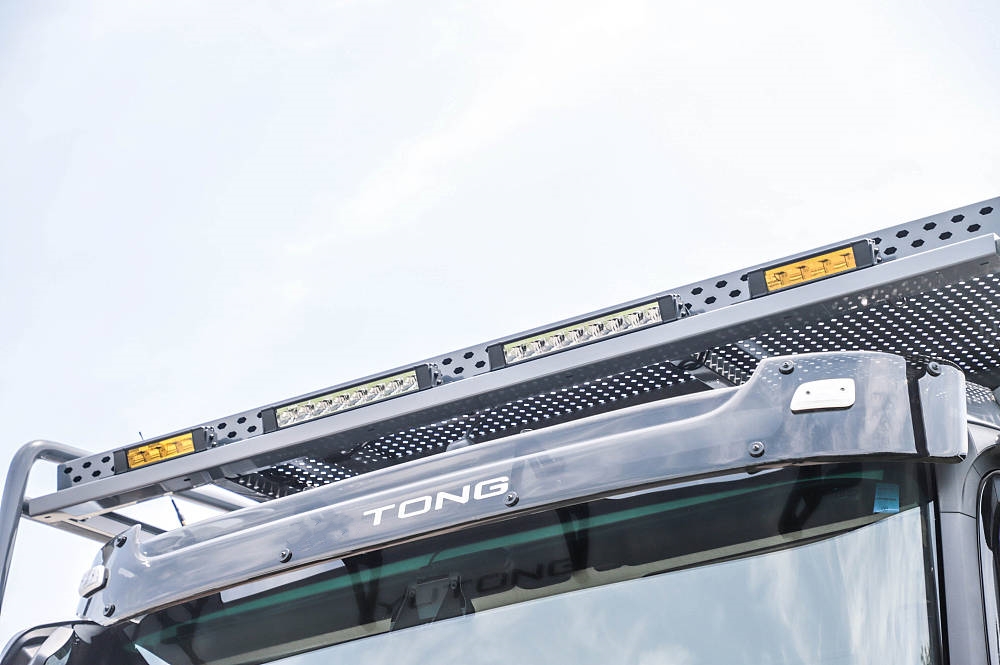 車頭位置,奔馳Arocs中網(wǎng)尺寸寬裕,這會帶來更好的撞風(fēng)散熱效果;大燈位置配有防護(hù)網(wǎng);頂部配備了定制防滾架,并裝配有LED照明燈帶。