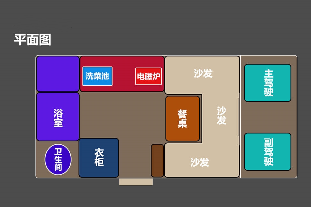 廂體與駕駛室中間設(shè)有通艙窗口,生活區(qū)內(nèi)部行駛中支持載客,前置U型沙發(fā)預(yù)留出兩張反向座椅,內(nèi)部可承載2名乘客。