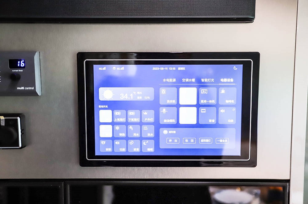 生活區(qū)中央控制模塊設(shè)置在進(jìn)門附近,主要通過觸屏進(jìn)行操作,一些重要的設(shè)施還能通過物理開關(guān)控制系統(tǒng)及平板控制系統(tǒng)操作,三種模式操作降低了故障情況。結(jié)合使用場景,宇通根據(jù)燈光、空調(diào)等智能家居擬定了娛樂、睡眠、布放、撤防模式,智能家居自動組合,操作方式簡單便捷。