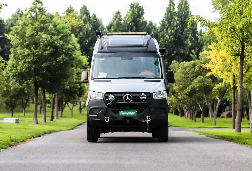 奔馳斯賓特(Sprinter) 4X4 B型房車在外觀上進行了全副武裝,每一處改裝件都能發揮重要作用。首先奔馳斯賓特底盤原廠狀態就能達到很好的離地間隙,如果后期改裝減振器、前后包圍,它的最小離地間隙、接近角、離去角將有更顯著的提升。