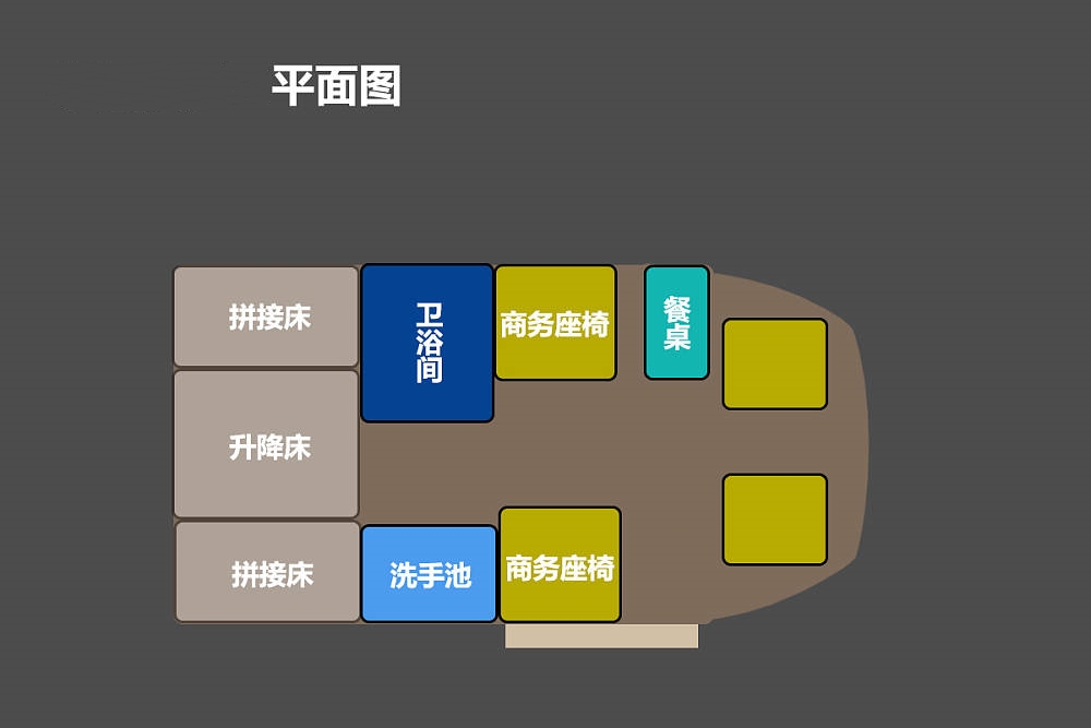 左側商務座椅后方是獨立衛浴間,內部采用一體式ABS吸塑工藝,具有更好的防水性,內部配置包括固定馬桶、淋浴花灑、毛巾桿、浴室鏡、衛浴簾等,翻轉洗手池還可以節省更多內部空間。