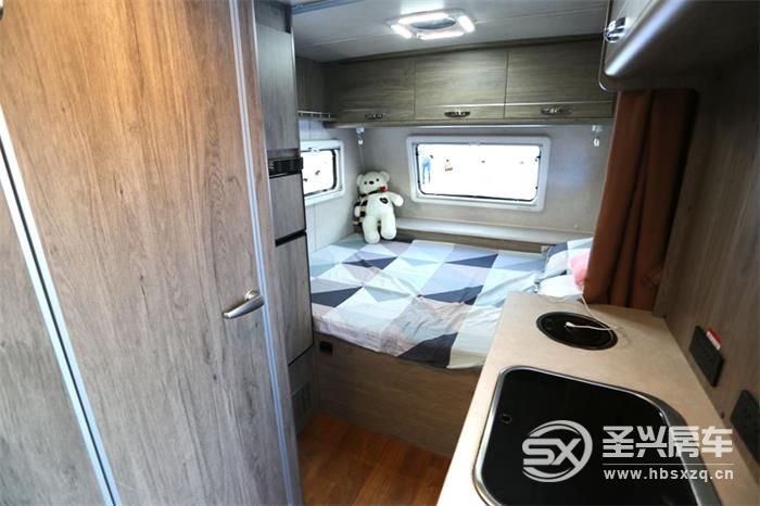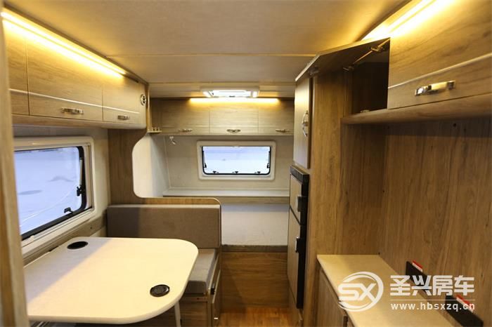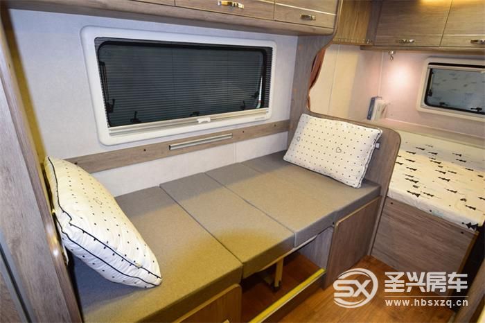 整車采用了PVC貼面板材家具,配有PVC防滑地板革、PVC防潮內飾板,高回彈床墊、房車專用底置空調。